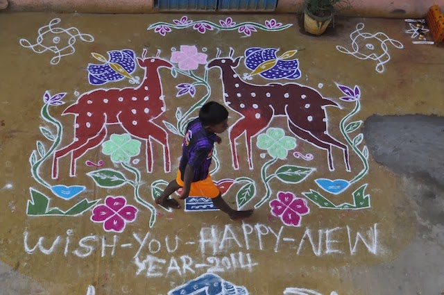 Une particularité folklorique de l'Inde du sud, c'est l'art du Kolam. Il se présente sous la forme d'un dessin au sol, notamment devant l'entrée de la maison, ou devant les représentations des divinités. Dans tous les cas, ce sont les femmes qui l'exécutent en général au levé du soleil et elles le font en l'honneur de la déesse Lakshmî, qui est invitée ainsi à apporter chance et prospérité dans la maison et la famille. C'est aussi un signe de bienvenue pour les visiteurs...